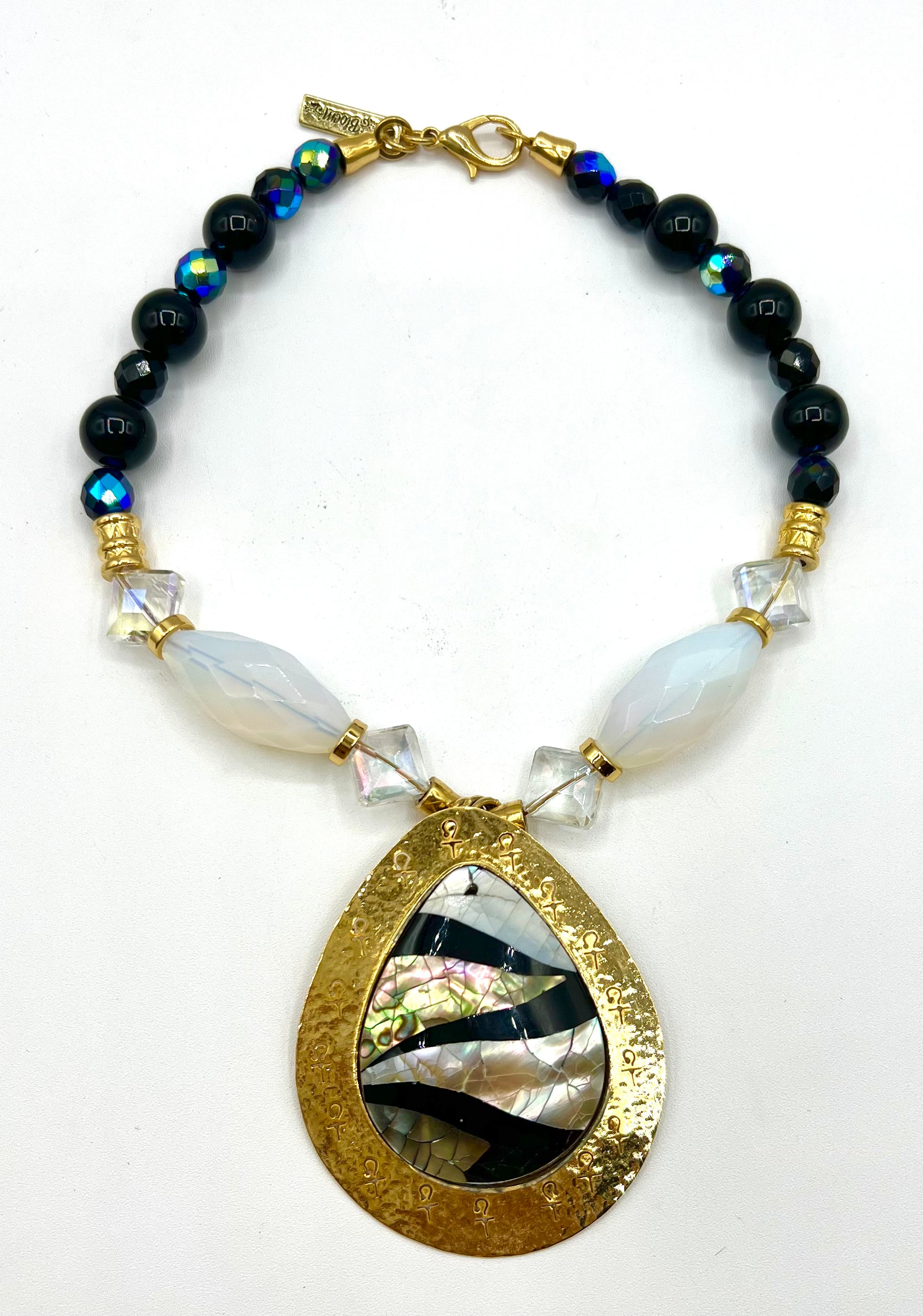 Large Bic Crystal Hand Made Necklace Ophiolite Abalone Shells, Obsidian, clear quartz Statement Large pendant gold