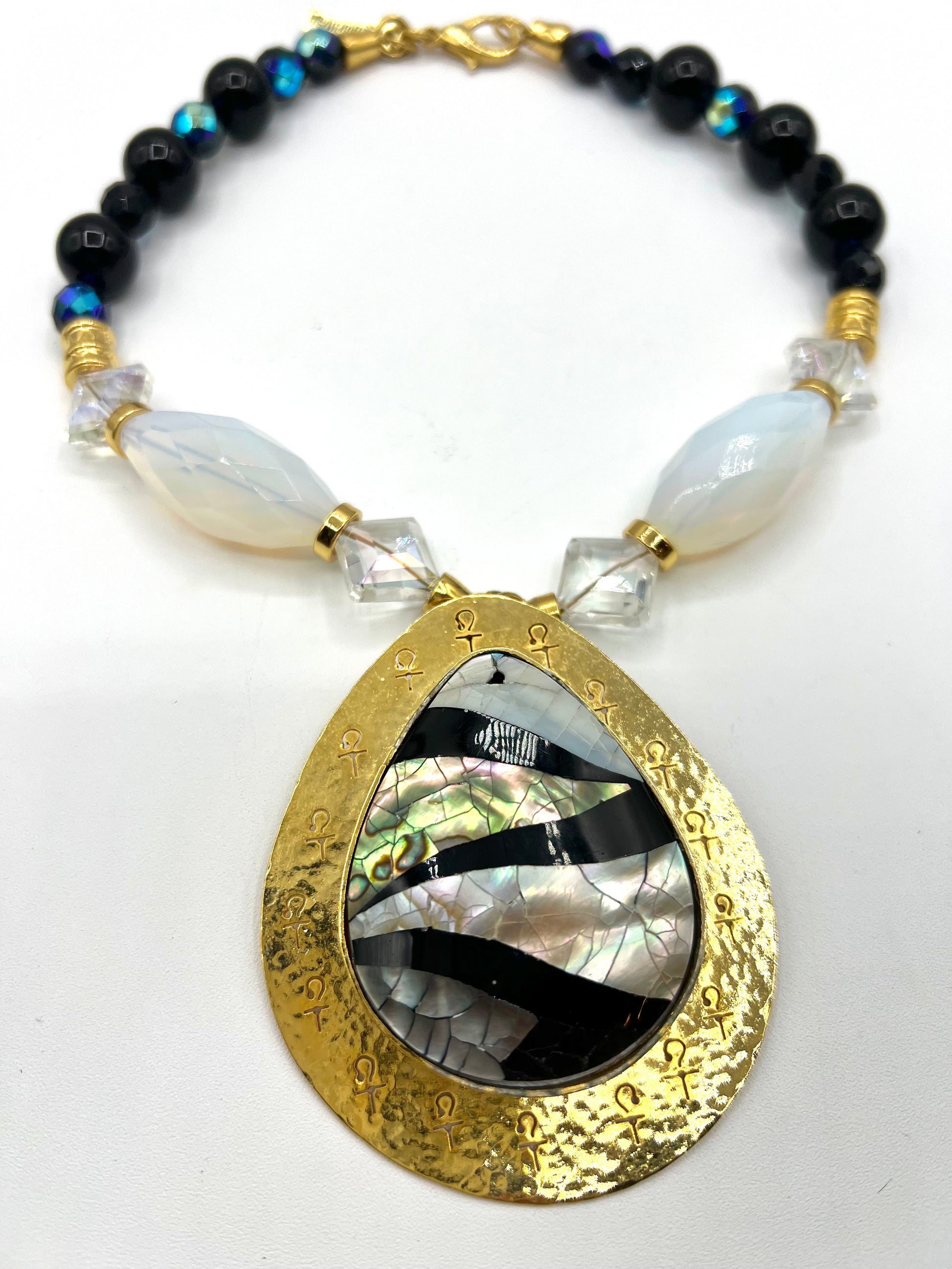This Large Handcrafted Necklace showcases a bold pendant featuring Ophiolite, shimmering Abalone shells, Obsidian, and clear Quartz crystals. The gold accents enhance its elegance, while the unique combination of stones promotes grounding, protection, and clarity. A striking statement piece, it blends natural beauty with spiritual energy for those seeking both style and healing. length 10" pendant length 3" width 2.5"