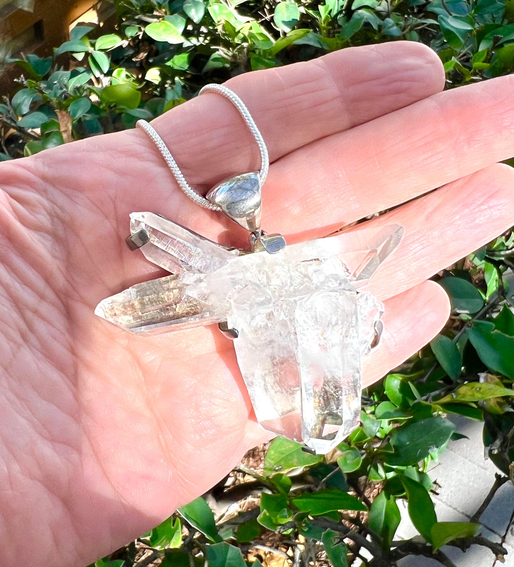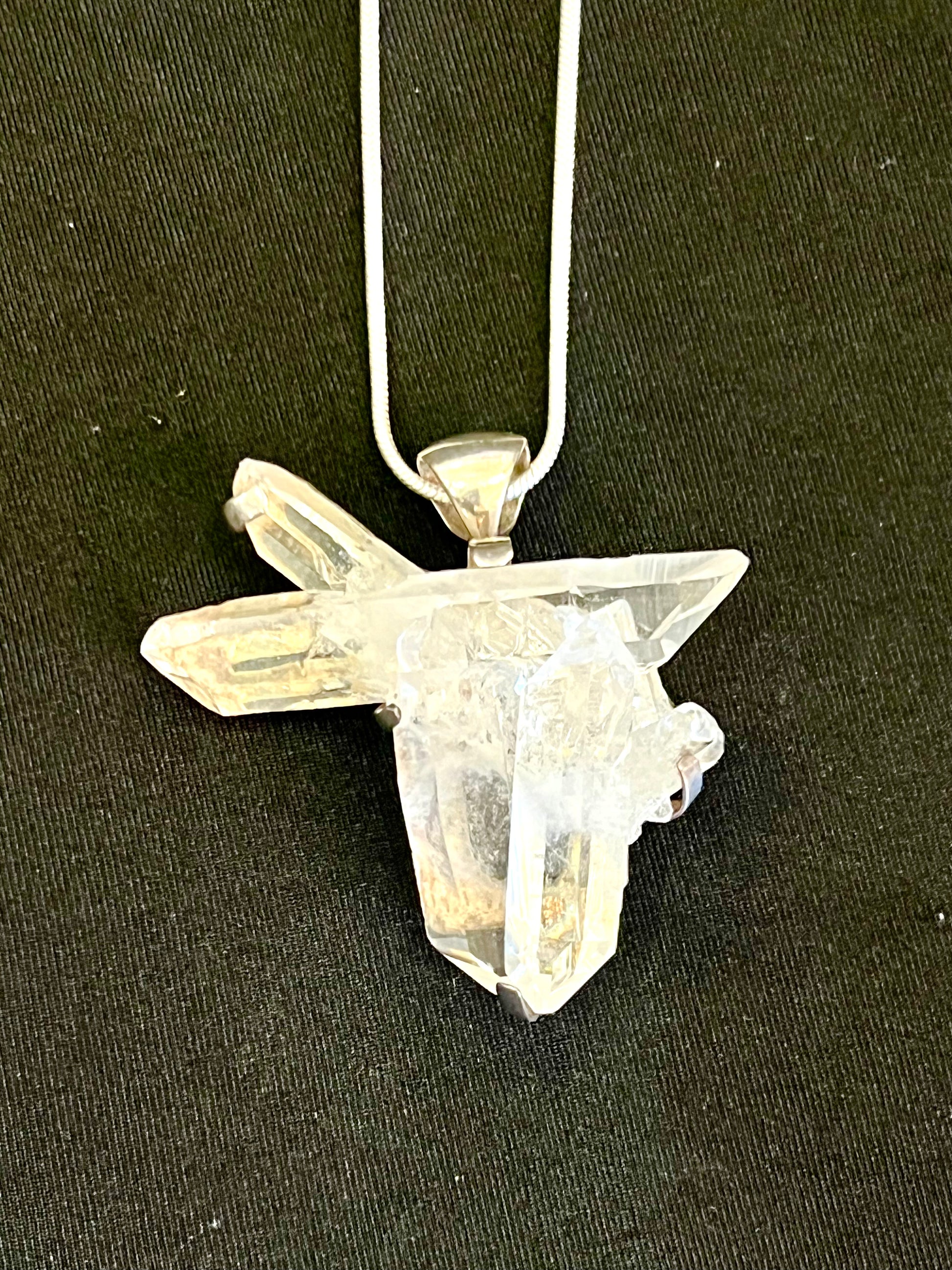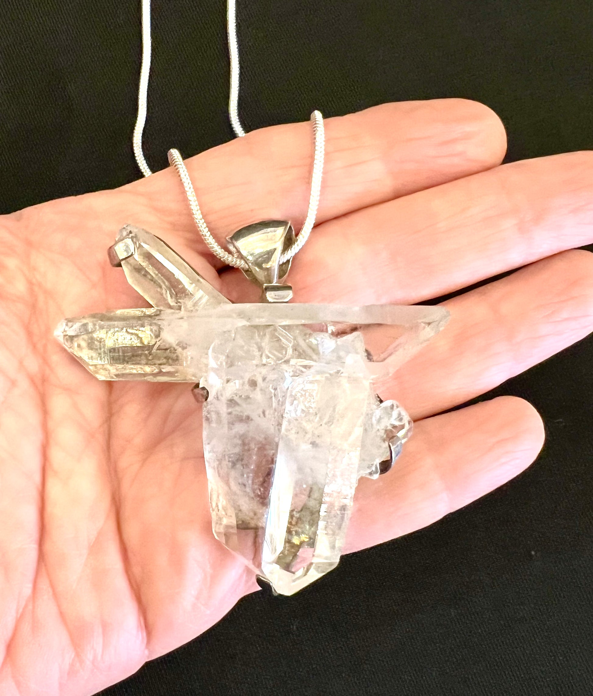 Large Clear Quartz Pendant Cluster Raw crystal Healing necklace Silver