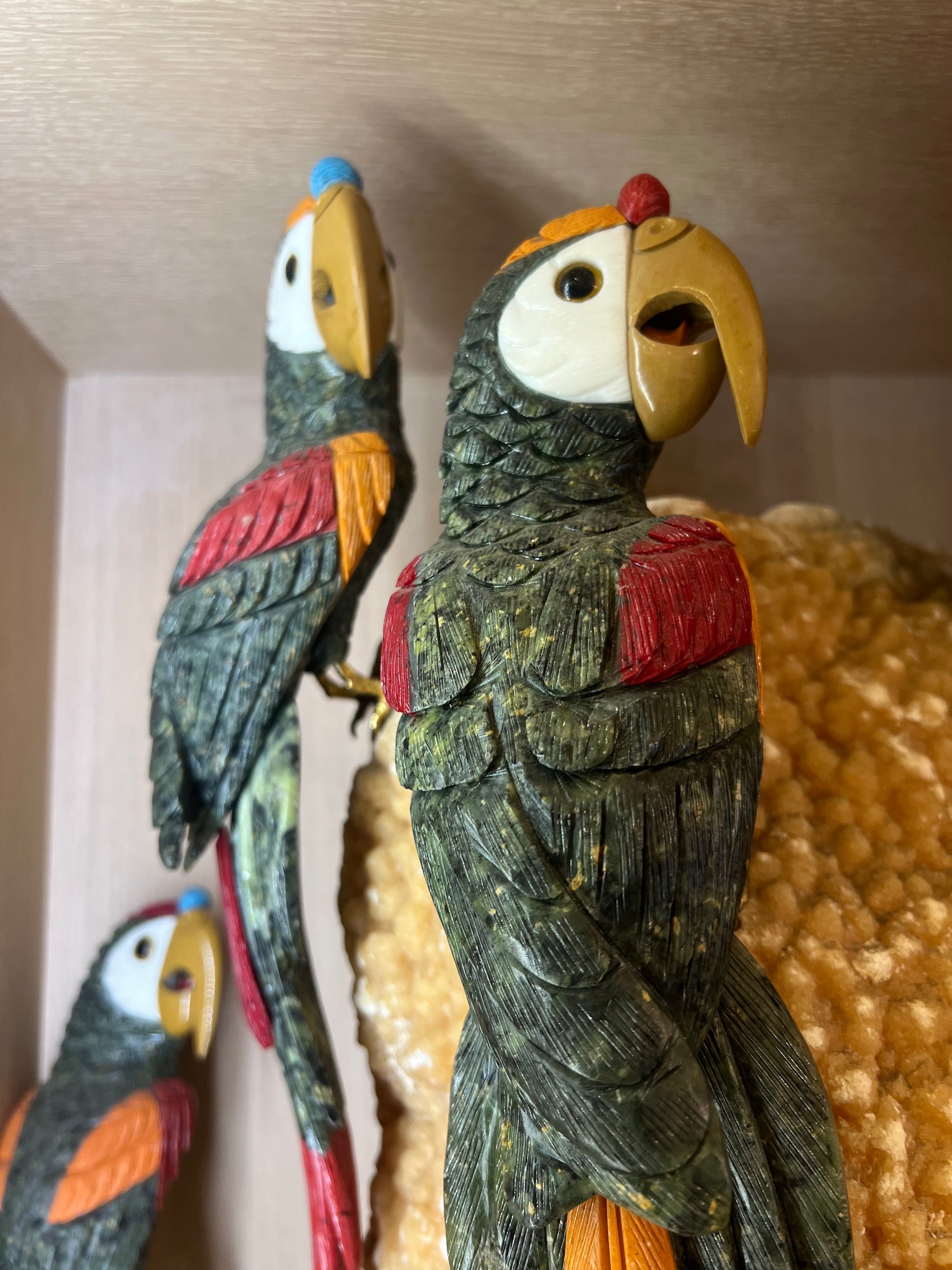 Macaw Parrots Carved From Semi precious gemstones on calcite Crystal cluster 24" by 13"