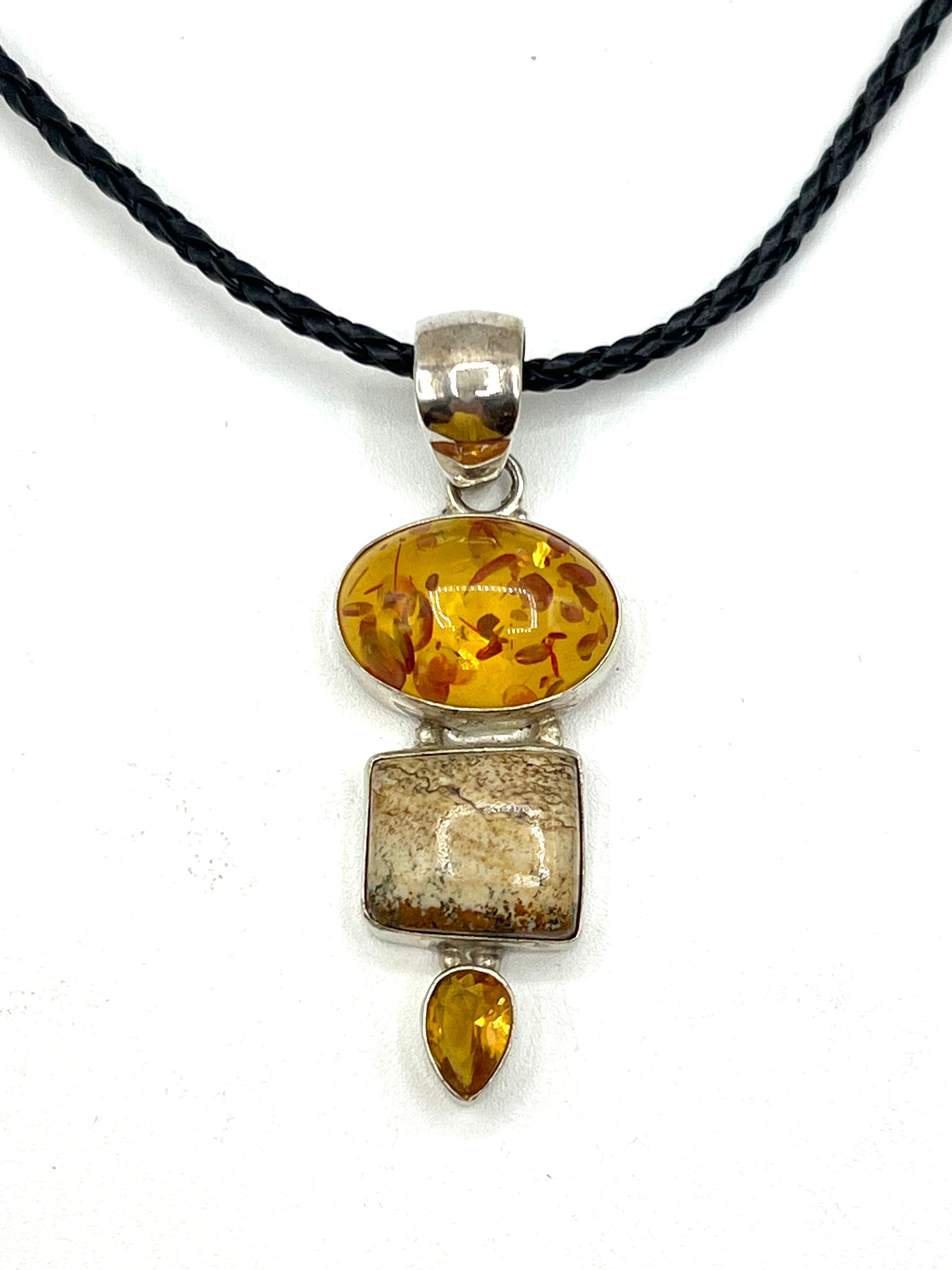 6.5 cm long, 2.5 cm wide. This stunning Amber Citrine Picture Jasper pendant is crafted in high-quality 925 sterling silver, offering a versatile accessory for both women and men. Featuring the earthy tones of Picture Jasper, complemented by vibrant Amber and Citrine stones, it captures natural beauty and grounding energies. Perfect for adding a unique touch to any outfit, this pendant is ideal for those who appreciate the harmony of style and spiritual connection. Comes with a cord.