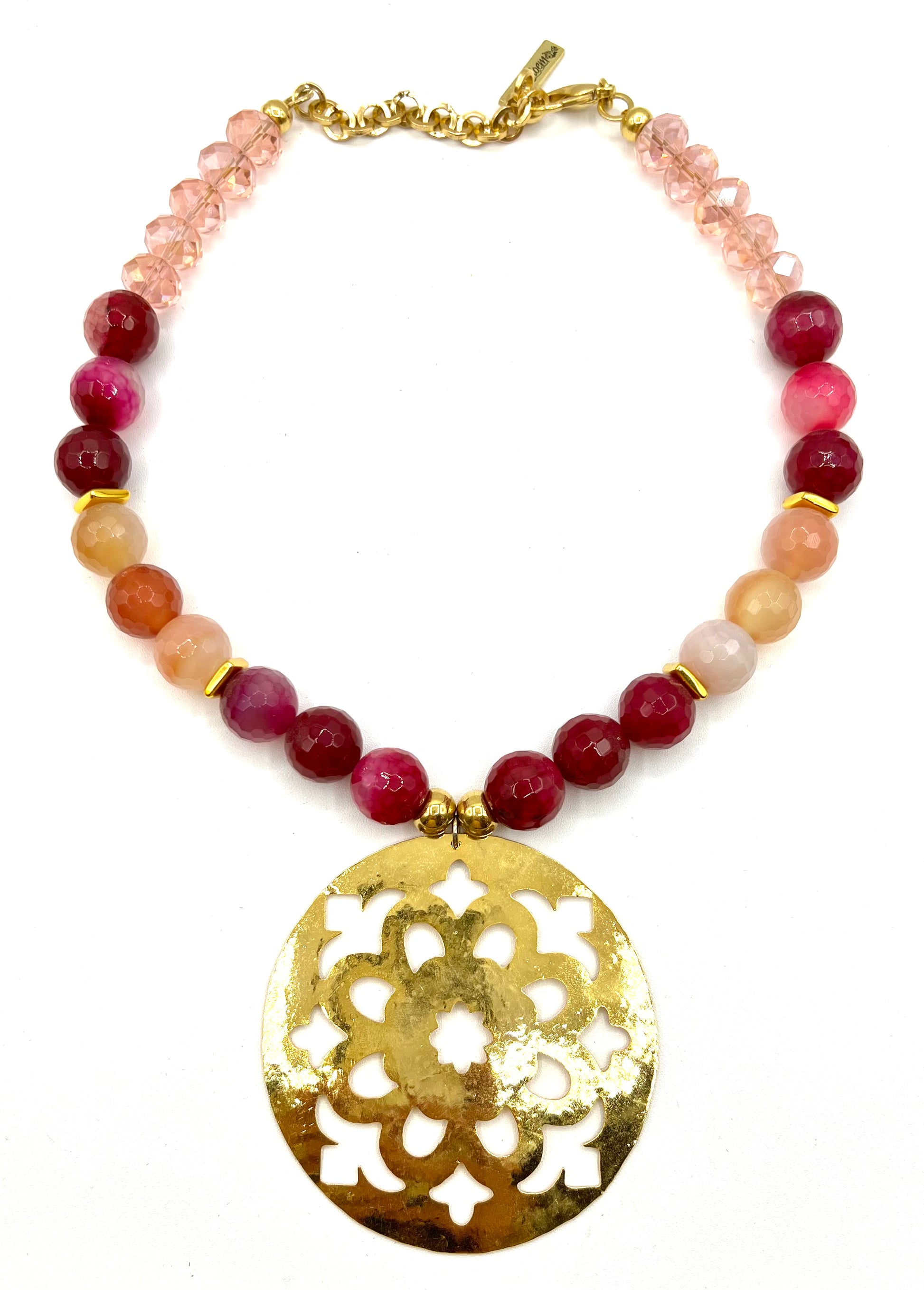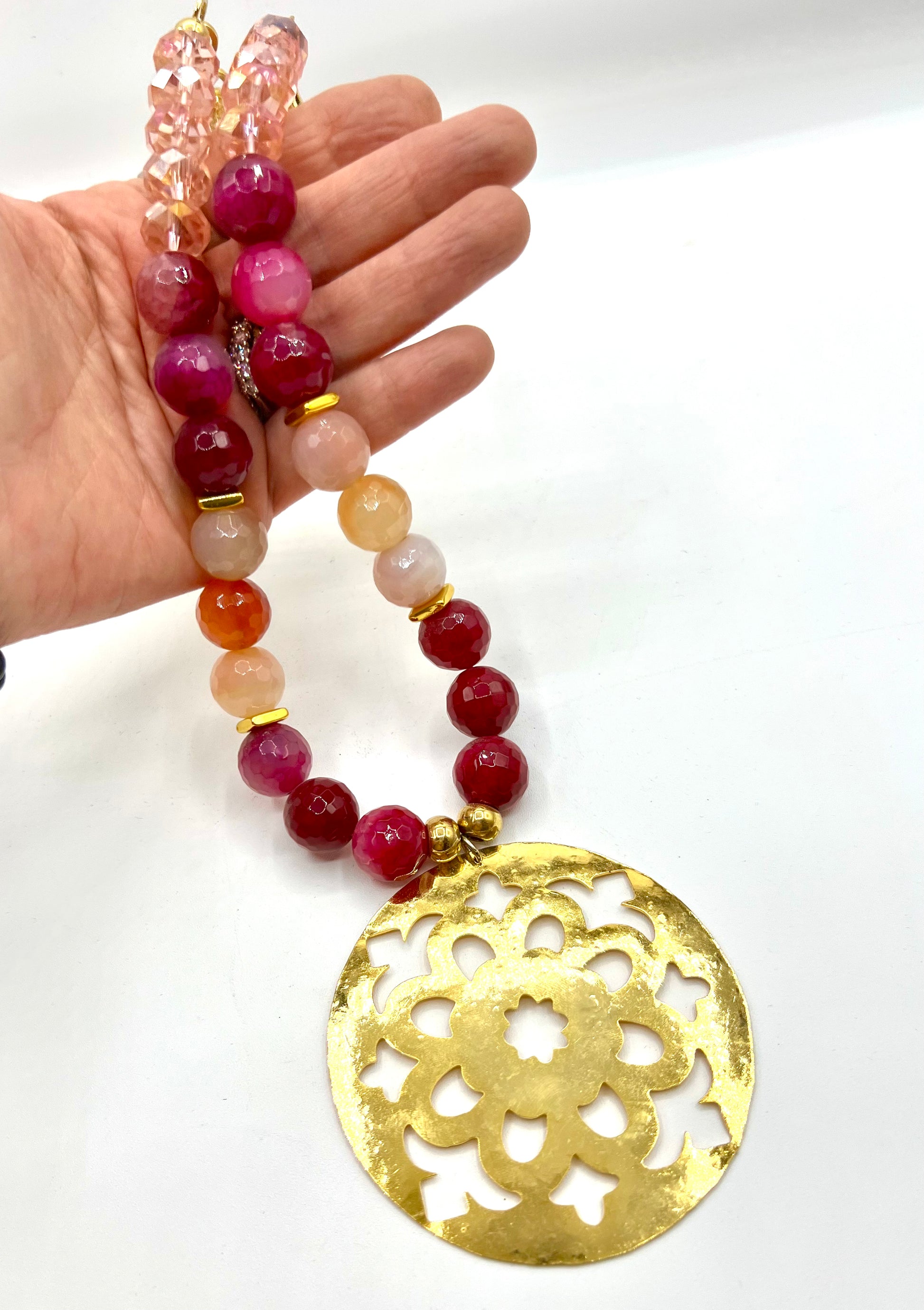 Pink Agate Crystal Statement Necklace Large Gold Pendant Bib