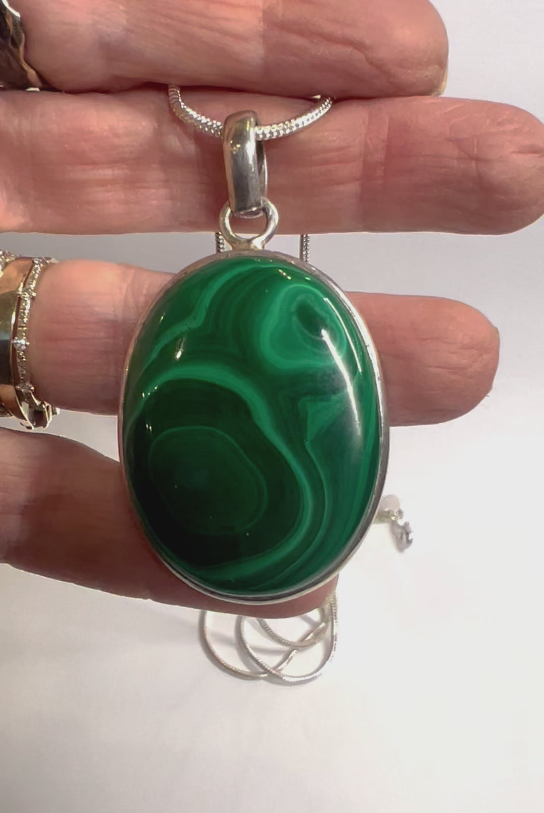 Bold Malachite Oval Pendant – Large Sterling Silver Statement Piece necklace 1.5" by 1 1/8"