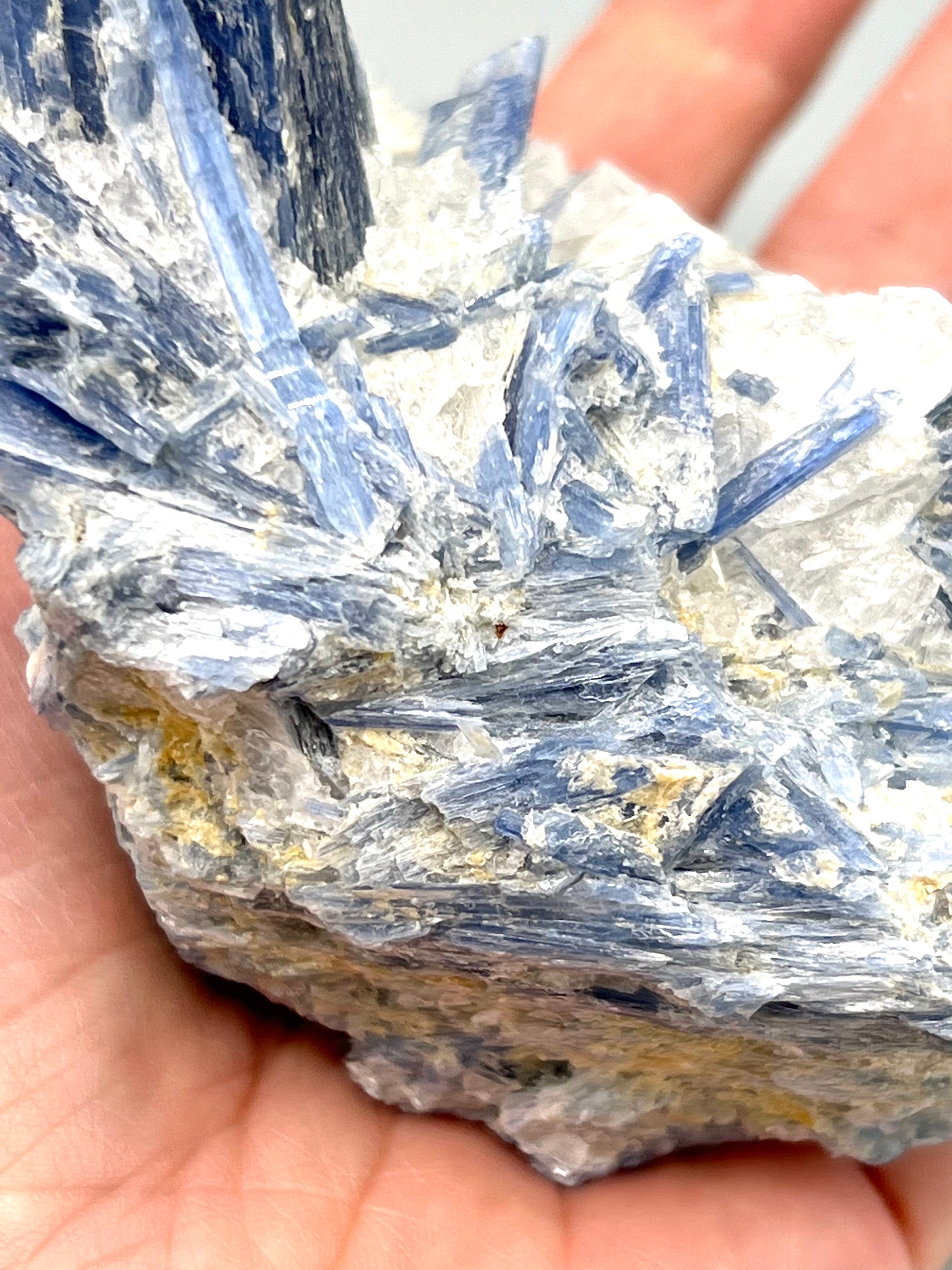 Blue Kyanite's light to deep blue energy stimulates, activates, opens, and heals the Throat and Third Eye Chakras. Kyanite encourages self-expression, speaking our truth, and all types of connection. Kyanite is a wonderful crystal to help easy communication.