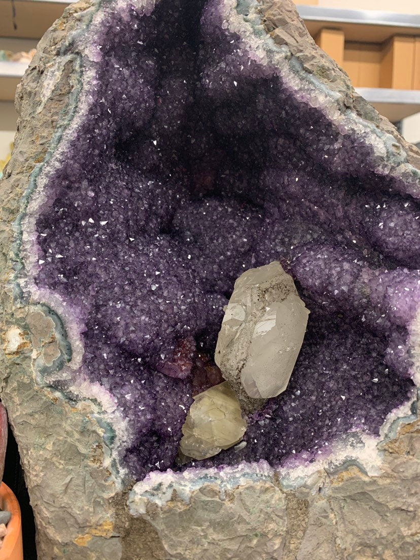 Amethyst is a stone of the third eye and crown chakras. It is a calming stone which works to provide balance, patience , and peace. An excellent all-purpose stone that increases spirituality and enhances Intuition and psychic powers, it opens channels to telepathy, past life regression,clairvoyance , & communication with angels. Aids in your personal healing process with the added quality of connecting to the higher realms to reach spirit guides and angelic beings, with calcite added it brings upon the energies of clarity of thoughts of manifestation and transformation. Stone Weight: 19 pounds Dimensions: